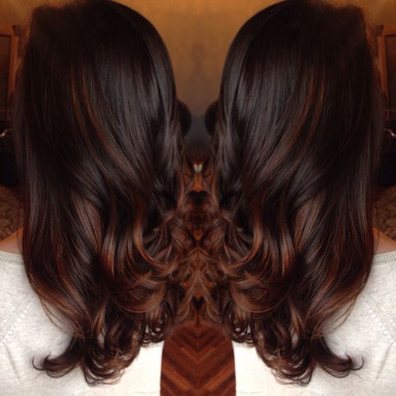 Brown caramel and blonde color mix reddish tones of brown are also a very popular solution in balayage. The honey highlights and chocolate brown lowlights create some serious dimensions that will leave even the finest of hair looking dynamic and voluminous. Espresso base with hazel ribbons.