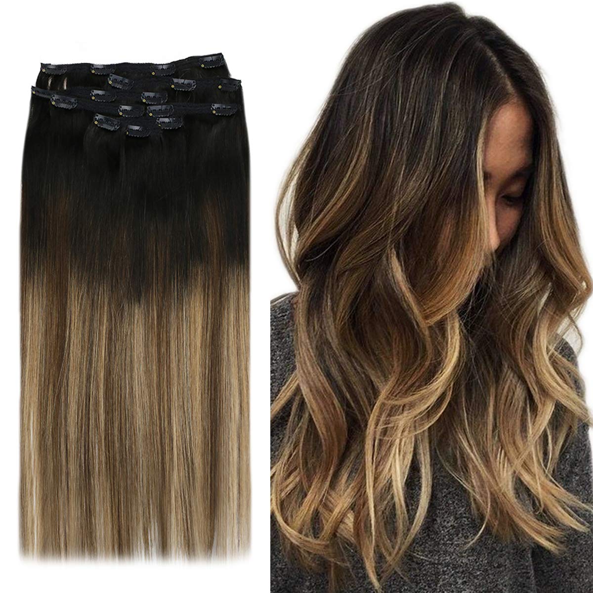Amazon Com Youngsee 20inch Ombre Human Hair Clip In Extensions Natural Black Fading To Dark Brown With Caramel Blonde Clip In Hair Extensions Dip Dyed Clip Human Hair Extensions Balayage 120g 7pcs