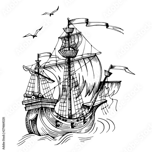 Sailing Ship Floating On The Sea Waves Caravel Santa Maria With Columbus Hand Drawn Design Element Vintage Vector Engraving Illustration For Poster Label Postmark Isolated On White Background Stock Vector C