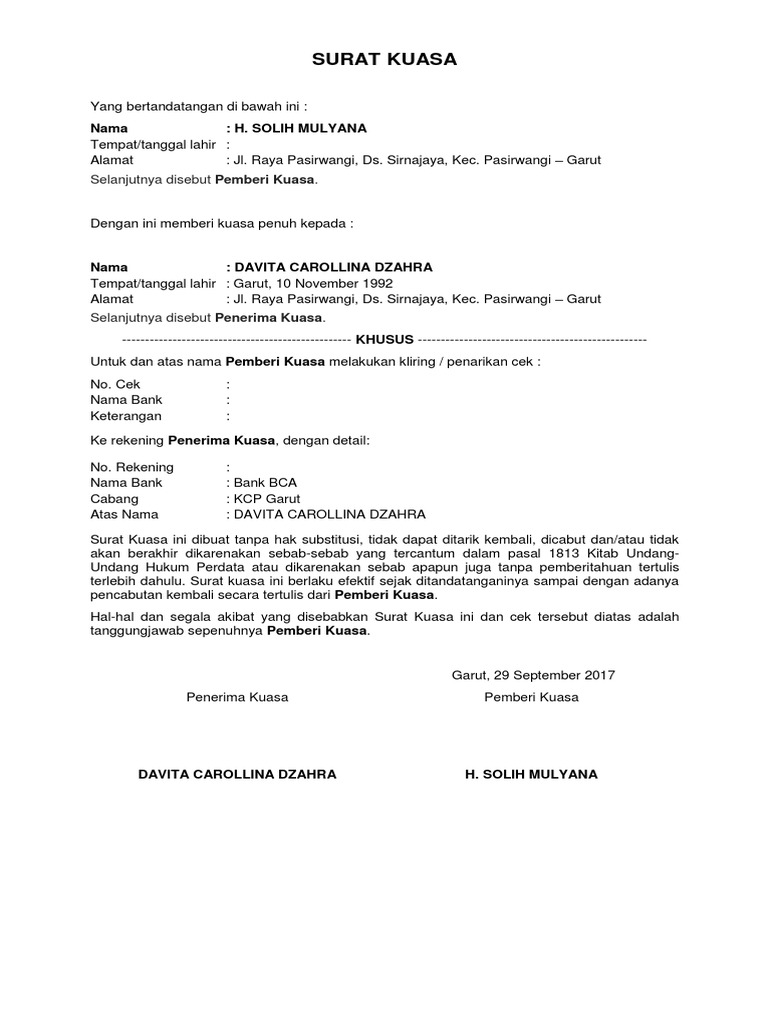 Contoh surat kuasa perwakilan memang kerap kali dibutuhkan saat seorang tidak bisa melakukan secara langsung sebuah pekerjaan namun masih tetap menginginkan pekerjaansuatu hal itu bisa tetap dapat dilakukan atau terwujud. Contoh surat kuasa pengambilan uang di bank mari kita lanjutkan pembahasan kita seputar dunia surat menyurat. Contoh surat kuasa kliring.