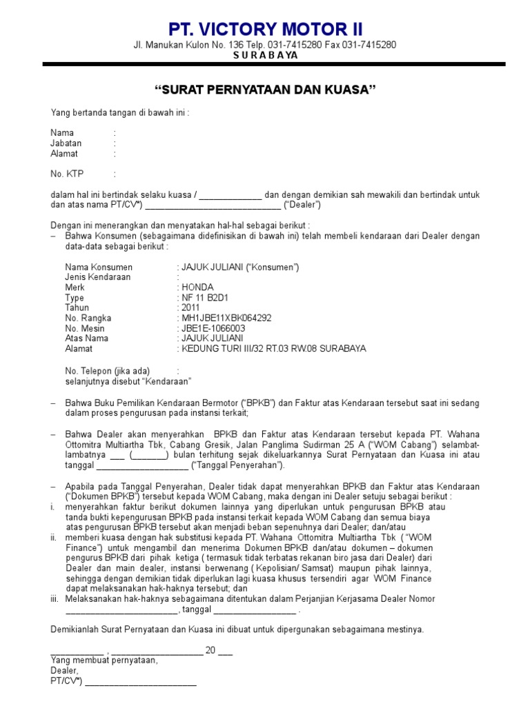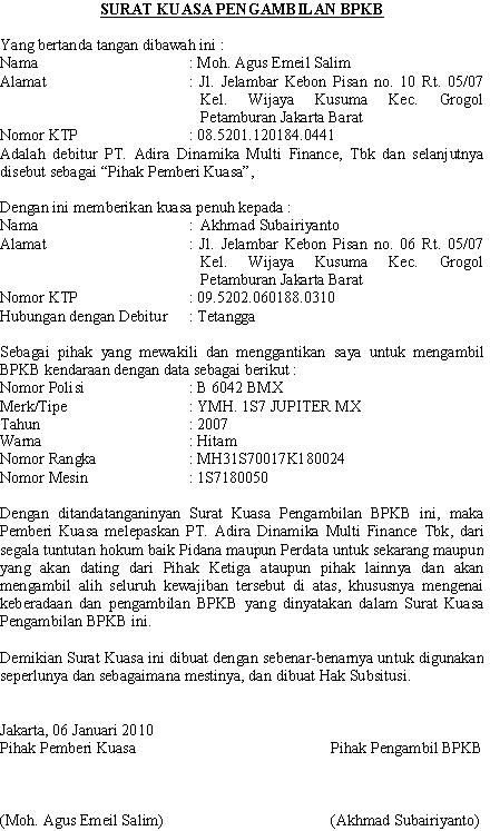 Download Contoh Surat Kuasa Ambil Bpkb Motor Terbaru 2019 Doc