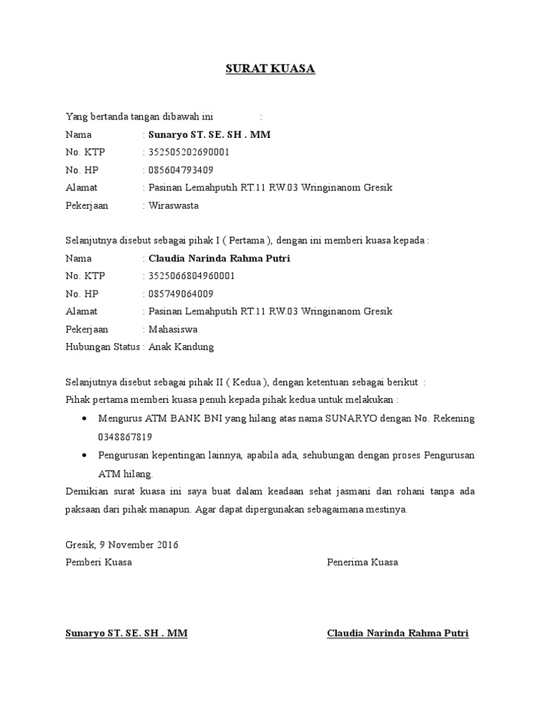 Contoh Surat Kuasa Pengambilan Uang Di Bank Bca Bni Mandiri Bri Lengkap