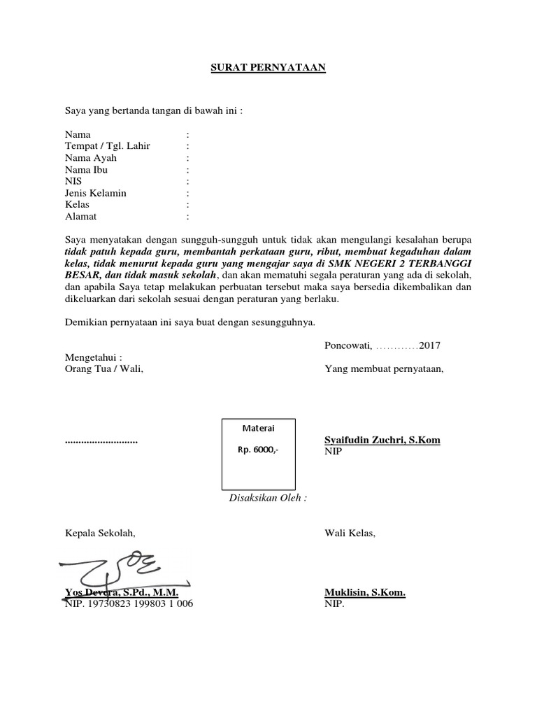 16 Contoh Surat Pernyataan Bersalah Di Sekolah