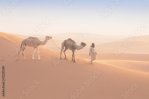 Bedouin And Camel On Way Through Sandy Desert Nomad Leads A Camel Caravan In The Sahara During A Sand Storm In Morocco Desert Stock Photo Image Of Dubai Sahara 168384848