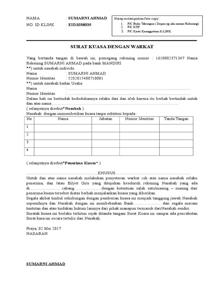 Contoh Surat Kuasa Pengambilan Uang Di Bank Yang Benar