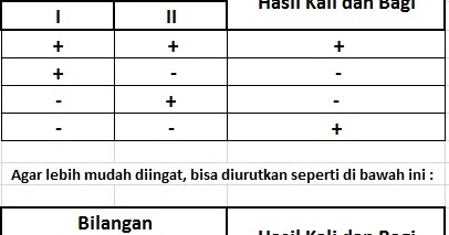 Perkalian dan pembagian bilangan bulat positif dan negatif merupakan salah satu bentuk operasi hitung bilangan bulat. Bilangan bulat mencangkup semua bilangan baik itu bilangan asli bilangan cacah bilangan prima bilangan komposit dan lain lain kecuali bilangan irasional imajiner dan pecahanuntuk lebih jelasnya mari kita lihat bagan dibawah berikut. Selain itu juga mencakup cacah bilangan prima bilangan asli bilangan nol bilangan dan bilangan komposit dan tidak mencangkup bilangan imajiner irrasional dan pecahan.