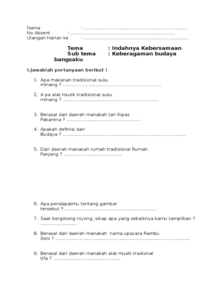 Soal Ulangan Harian Kelas 4 Tema 1 Indahnya Kebersamaan Sub Tema 2 Kebersamaan Dalam Keberagaman Devina Mutia Azzahra