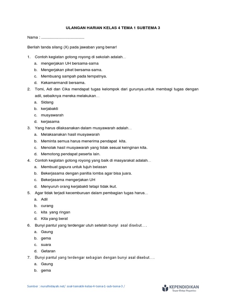 Soal Uh Kelas 3 Tema 5 Subtema 1 Subtema 2 Subtema 3 Dan Subtema 4 Contoh Rpp Sd Dan Soal Sd