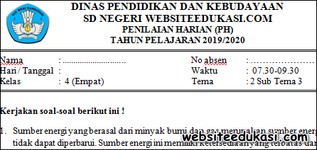 Soal Ulangan Harian Tematik Kelas 4 Empat Sd Mi Tema 2 Subtema 3 Energi Alternatif Ahzaa Net