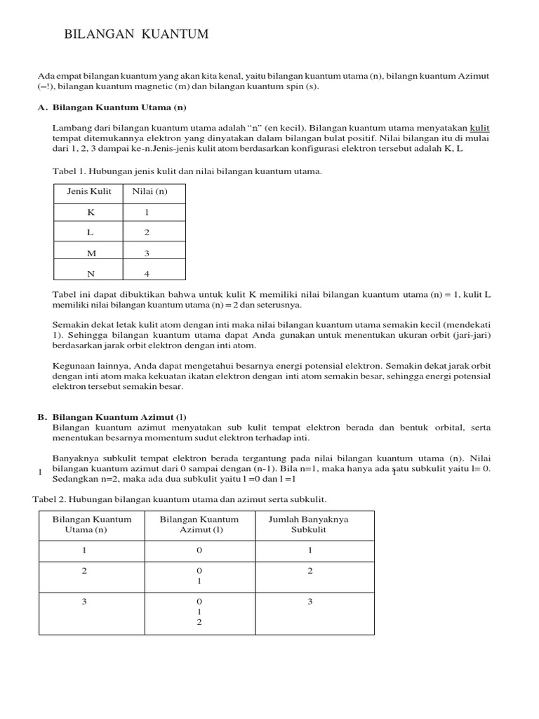 Dari keempat set bilangan di atas tersebut tingkat energi orbital ukuran bentuk probabilitas radial orbital atau bahkan orientasinya juga dapat diketahui. Bilangan kuantum utama c. Tabel diatas menunjukan hubungan antara bilangan kuantum utama n bilangan kuantum azimuth l dan bilangan kuantum magnetik m.